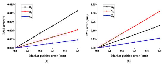 The root mean square (RMS) error of 6-DOF with respect to marker position error: (a) the error of rotation angle and (b) the error of system position.