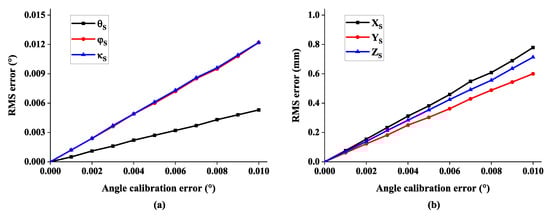 The RMS error of 6-DOF with respect to angle calibration error: (a) the error of rotation angle and (b) the error of system position.