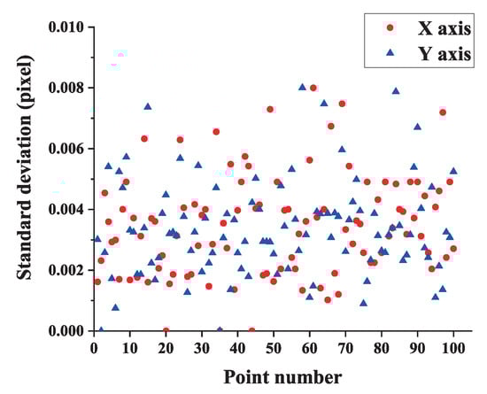 The helmet is randomly placed at ten different positions in the measurement field, and five images are captured at each position. Feature points are all extracted and the pixel coordinate repeatability of each point is shown in Figure 14. From the results, we can observe that the extraction precision of feature points in either axis is better than 0.01 pixel.