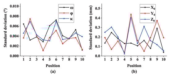 Then 6-DOF of the multi-camera rig are calculated, and 6-DOF measurement repeatability at each position is analyzed. As shown in Figure 15, standard deviations of positions along global coordinate axes are less than 0.5 mm and standard deviations of three rotations are better than 0.01°.