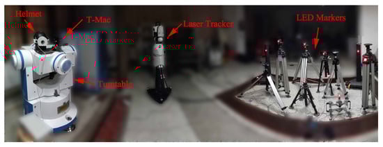 As shown in Figure 17, the helmet and the Leica T-Mac are both mounted on the three-axis turntable to assess the dynamic 6-DOF measurement accuracy. Based on the experiment setup, T-Mac has a 0.01° rotational accuracy and about 30 µm positional accuracy. The spatial relationship between these two devices remains constant, no matter how the turntable rotates. Ten LED markers are deployed about five meters in front of the turntable, and their three-dimensional coordinates are measured using Leica AT901 laser tracker. In consequence, positions and orientations of the helmet and the T-Mac are unified in the laser tracker coordinate system O-.