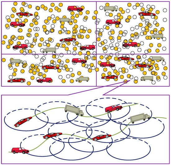 In the covering process on the node which is the target node, usually the full coverage over the entire monitoring area is employed [15,16,17]. However, we utilize the partial consecutive coverage, focusing on the target node. That is, we only consecutively cover the moving target node which we focus on. The main reasons behind this are that (1) during the whole operation period of this network, putting all the nodes into work would rapidly exhaust the node energy, and (2) the required coverage degrees of different monitoring areas are different when we re-partition the whole monitoring area. Therefore, the network energy would also quickly run out if we put all the nodes in the monitoring area into work. Finally, (3) During the consecutive coverage process over the moving node, the coverage blind area would exist since some nodes are dead or not awakened by some algorithm. We take the moving target node as an example and give the illustration of the consecutive coverage, which is shown in Figure 1.