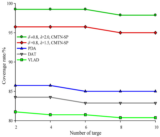 The network coverage performances versus the number of sensor nodes under different monitoring area are illustrated with δ = 0.3 and δ = 0.8 form Figure 4, Figure 5 and Figure 6, respectively. It is shown in the figures that the network coverage rate increases for all the four algorithms with the number of sensor nodes. Generally, the proposed algorithm outperforms the other three algorithms in terms of the network coverage rate. It is shown in Figure 4 that when the number of nodes is equal to 200, the coverage rate of the proposed algorithm is 80.2% and 75.4%, while those for the other algorithms are 72.1%, 69.95%, and 68.01%, which is below the performance of the proposed algorithm. It is shown in Figure 5 that when the monitoring area is 400 × 400 m2 and the number of sensor nodes is 300, the proposed algorithm shows a more prominent increase in network coverage rate than the others. The main reason behind this is that we adopt the controllable parameter λ to adjust the coverage rate within the entire monitoring area, so that we can adjust to the changing coverage rate during the consecutive coverage over the moving target node. The network coverage rate is improved by 16.32% on average. The analysis process in Figure 6 and Figure 7 is similar to that in Figure 4 and Figure 5. The comparison on the network coverage rate with δ = 0.3 and δ = 0.8 is also presented in Figure 8 and Figure 9 for the moving target node. We can see that with an increasing number of moving target node, the network coverage rate decreases for all the four algorithms. But the proposed algorithm shows the least magnitude of decrease, which does not influence the coverage effect over the entire network. The main reason behind this is that the controllable parameter could maintain the network coverage within a certain range, which guarantees the robustness and scalability for the proposed algorithm.
