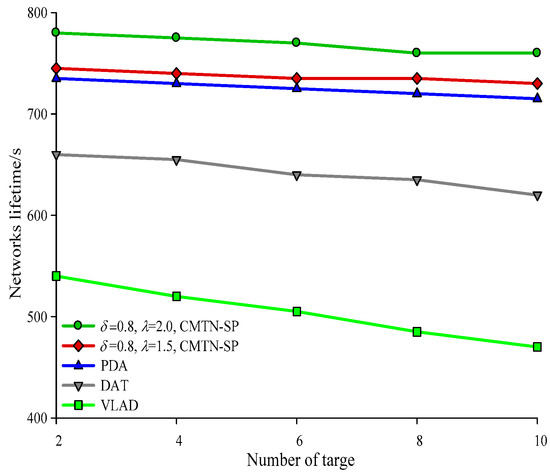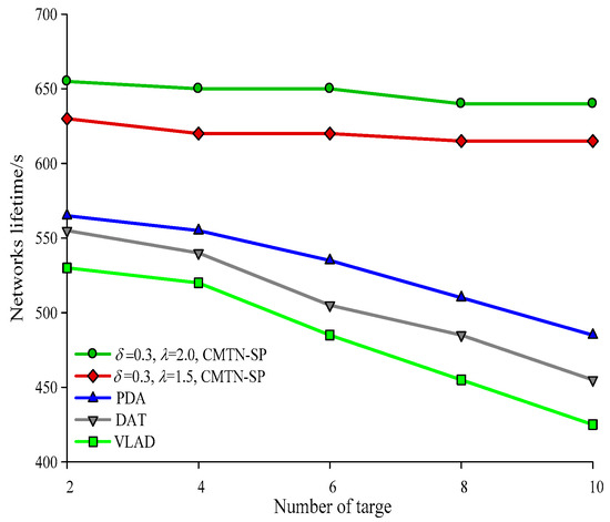Figure 10, Figure 11, Figure 12 and Figure 13 give the network lifetime performance versus the number of sensor nodes with δ = 0.3 and δ = 0.8. It is shown from the figures that with an increasing number of sensor nodes, the network lifetime is prolonged for all the four algorithms. In Figure 10, when the number of sensor nodes is 250, the network lifetime of the proposed algorithm is 450 s and 420 s, while those for the other algorithms are 410 s, 305 s and 295 s. In Figure 11, when the number of nodes is 500, the network lifetime of the proposed algorithm is 520 s and 400 s while those for the other algorithms are 380 s, 340 s, and 240 s. The main reason behind this is that the other three algorithms employ the centralized coverage while we employ the distributed coverage. Meanwhile, the other three algorithms do not consider the transformation process among different nodes and they require more energy consumption for the network. The proposed algorithm increases the network lifetime by 13.07% compared with the other three algorithms. The network lifetime versus the number of moving target nodes with δ = 0.3 and δ = 0.8 are shown in Figure 14 and Figure 15. It is shown that with an increasing number of moving target nodes, the network lifetime of all the four algorithms are decreased. We take Figure 14 as an example. When the number of moving target nodes is 6, the magnitude of decrease is larger for the other three algorithms. The main reason behind this is that the other three algorithms employs the centralized coverage scheme, without considering the coordination among different nodes, which leads to the rapid exhaustion of these three algorithms and a shorter network lifetime compared with the proposed algorithm.