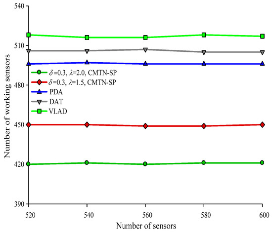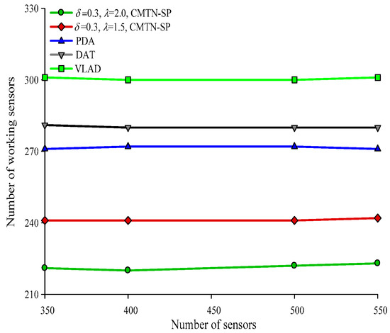 The number of working nodes versus the number of nodes with 400 × 400 m2, δ = 0.3.