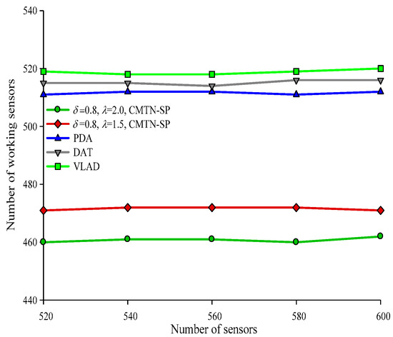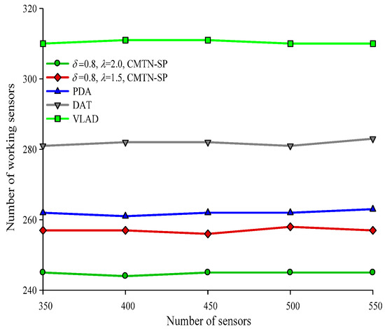 The number of working nodes versus the number of nodes with 400 × 400 m2, δ = 0.8.