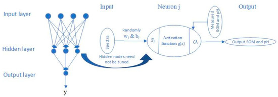 Algorithm ELM: For N distinct samples (xi, ti), where xi = ∈ Rn, xi were soil spectra, while ti were the observed values of either SOM or pH.