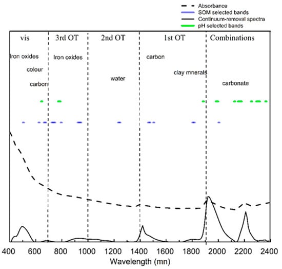 The averaged spectra of 350 calibration samples measured in the laboratory are shown in Figure 3. Five apparent absorption regions can be seen in the absorbance spectra and their continuum-removal spectra. Absorptions near 600 and 900 nm are primarily associated with some minerals containing hematite and goethite [34], while those near 600 nm also result from chromophores and the darkness of organic matter [4].