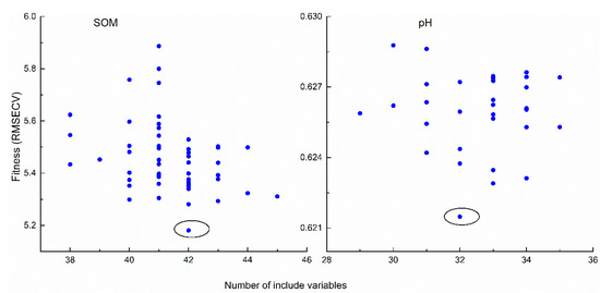 The best variables selected by GA on the basis of the RMSECV of pH and SOM used as a fitness function in GA analyses can be seen in Figure 4. The lowest values of the RMSECV of pH and SOM were 0.62 and 5.20 when 32 and 42 variables (circle) were selected, respectively. These optimal variables were used to build four models (Figure 4). These models were also used to compare the model that used the full bands to find the best machine learning methods for predicting pH and SOM.