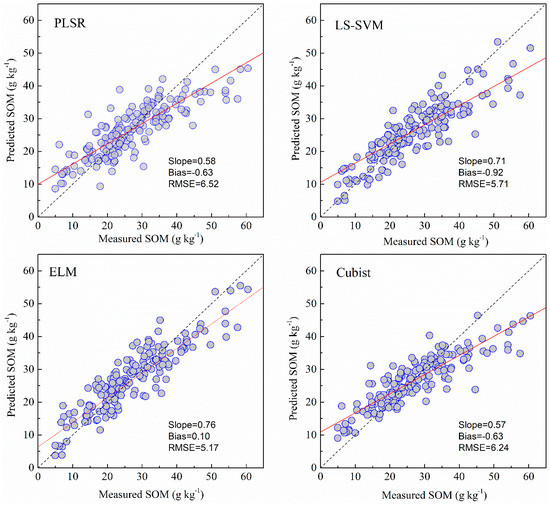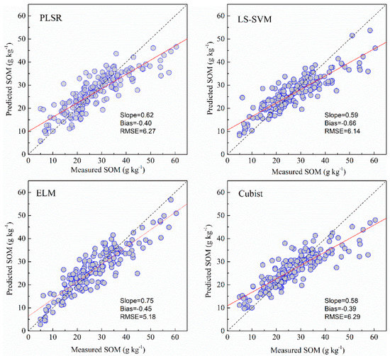 Predicted values plotted against measured values of the validation set for SOM using the PLSR, LS-SVM, ELM and Cubist methods with full bands.
