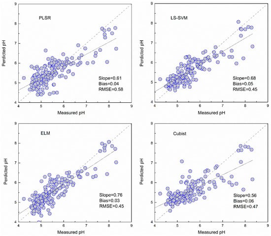 As shown in Figure 5, Figure 6, Figure 7 and Figure 8 and Table 3, the ELM model outperformed the PLSR, LS-SVM and Cubist models for prediction of SOM, regardless of whether the full bands (R2 = 0.81, RMSE = 5.18, RPIQ = 2.83) or reduced bands (R2 = 0.81, RMSE = 5.17, RPIQ = 2.87) were used. The LS-SVM and ELM for pH prediction using the full bands (Table 3) produced similar results (R2 = 0.74, RMSE = 0.45 and PRIQ = 2.07) and outperformed the PLSR and Cubist models. When the reduced bands were used, ELM had the best accuracy for prediction of pH (R2 = 0.76, RMSE = 0.43, RPIQ = 2.15).
