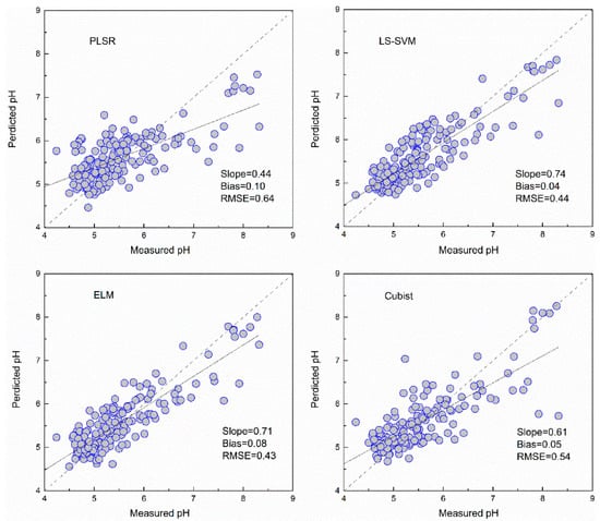 The non-linear ELM method showed the best performance, while the LS-SVM performed slightly better than the Cubist model. The scatterplots of the predicted vs. measured soil properties illustrated in Figure 5, Figure 6, Figure 7 and Figure 8 show that PLSR did not predict the higher and lower values of SOM and pH well when compared with the LS-SM, ELM and Cubist methods. The Cubist model and LS-SVM succeeded in predicting the high nonlinearities with the full and selected wavelengths when compared with the PLSR. The prediction values in the low and middle ranges were more compact; however, the LS-SVM method showed better prediction performance ability than the Cubist model, which is similar to the results reported by Morellos et al. [14].