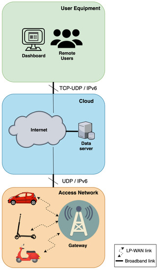 One vertical that is experiencing a considerable revitalization since the appearance of IoT-related services and the upcoming 5G is the vehicular sector [6]. Under the umbrella of Intelligent Transportation Systems (ITS) and Internet of Vehicles (IoV) paradigms, many novel services will take advantage of the rich variety of connectivity options that vehicles will present in the near future [7]. The integration of different communication technologies on-board vehicles will enable the development of solutions in many areas, such as safety, green transport, goods or fleet monitoring, and traffic analysis, among others. Although some efforts were done in these directions some years ago, during the emergence of IEEE 802.11p-based technologies, the need for deploying dedicated infrastructures, together with the limited range of Vehicle-to-Vehicle (V2V) communications and the penetration rate issue, lead to a deceleration of these initiatives [8]. For that reason, the integration of a series of Radio Access Technologies (RAT) in a single on-board control system has been envisioned as a promising step in gathering all of the services and applications mentioned above, which are highly related to the concept of smart cities or, in general, smart spaces [9]. While the integration of cellular technologies in the vehicular ecosystem has been deeply studied in the past years [10,11,12], the use of LPWAN-based solutions in this area has not been exploited yet [13,14,15], and they could present a real alternative for battery-constrained transport means, such as scooters or bikes.