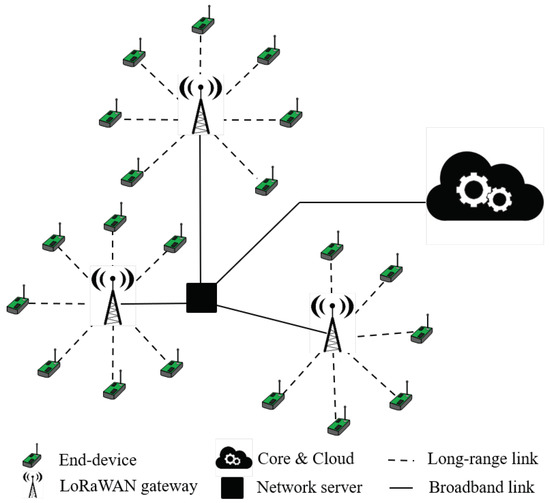 Regarding the architecture of LoRaWAN networks, as shown in Figure 2, there is another layer on top of the PHY level (LoRa) that gives the name to the whole system, LoRaWAN. Actually, it defines the MAC-layer mechanisms and other architectural aspects, such as network security and its organization. Regarding the latter, LoRaWAN makes use of a star or star-of-stars topology (Figure 3). This architecture permits simple and direct communication between end-devices and the gateway, hence avoiding other configurations with higher complexity (such as mesh networks). Observe in Figure 3 that end-devices directly transmit to the gateway in one single hop (i.e., without the help of the rest of the network).