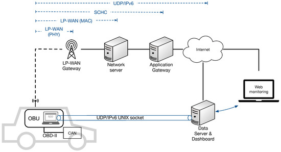 The potential of SCHC was initially evaluated in our previous work in Ref. [29], providing promising results by transmitting Internet Control Message Protocol version 6 (ICMPv6) packets in a real environment. In this paper, this work is extended by addition of a data gathering platform (that uses OBD-II for the case of regular cars), a monitoring web-based interface and, above all, a remarkable development of a generic UNIX network interface to transmit IPv6/UDP packets over LPWAN.