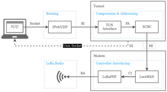 Regarding the UNIX network interface for LPWAN, the RI interface has been implemented using the ip UNIX command, in order to establish the forwarding rules to enable the transmission of packets through the new interface. No packet filtering has been established for incoming communications. The PA interface has been achieved by cloning the UNIX /dev/net/tun interface into a new tunneling interface to be controlled with ioctl calls. The flags IFF_TUN and IFF_NO_PI have been used in the ioctl interface request ifreq. When the packets are captured by our middleware through this new interface, they are processed and sent to the SCHC software module, which is an evolution of the implementation presented in Ref. [29] whcih now supports UDP/IPv6 compression. The MI interface with the modem is based on serial port communication, using a block-based device and an interface of type /dev/ttyUSB*, given that a USB-to-serial converter is used.