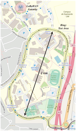 As explained before, the designed and implemented system is devoted to monitor and report the current status of road vehicles. Concretely, our validation test has been contextualized in the task of monitoring the vehicles employed for providing public services within the University of Murcia (Spain) campus, e.g., postal service or internal transport. As shown in Figure 6, the main road in the campus is a ring that links the different faculties or service buildings. The major axis of this ring is 1 km long. This scenario presents high tree areas, buildings of up to five floors, and other obstacles for the wireless propagation, which convert this scenario in a realistic test-bench for our real-time vehicle monitoring platform. Please, note that the gateway location has been indicated as well in Figure 6, which was affixed on the roof of an annex building of the Computer Engineering Faculty. This is an elevated position with respect to the ring area, which was the main region of study in our tests.