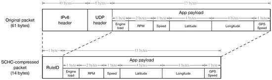 As stated above, and further discussed in Ref. [31], the restrictions posed by the LPWAN link leads to the need of employing compression schemes with the aim of optimizing the size of the packets to be sent in this constrained transmission channel. To address this need, our SCHC module has been developed on the basis of the guidelines described in Ref. [28]. In SCHC, the end-node and application gateway (Figure 4) share a common pre-provided context that indicates how to manage the information contained in the protocol headers, in order to remove them from the packet sent over the LPWAN link. Thereby, Figure 7 illustrates the original packet, and the one outputted by the SCHC module of our solution. The SCHC rule applies the compression action for all of the header fields. This is possible thanks to knowing, in this case, the IPv6 addresses, UDP ports, and other static configurations of both ends (pre-provided context). This way, the 40 Bytes of the IPv6 Header, and the 8 Bytes of the UDP header, are compressed down to 1 Byte, by including a new SCHC header called RuleID, which indicates the way to proceed with the packet once it reaches the application gateway. As can be seen, the application payload remains untouched.