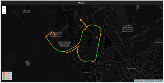 Following the architecture presented in Figure 4, during the tests the data transmitted from the vehicle were received and forwarded by the gateway towards a central data server in the cloud, which processed and presented this information by means of a web-based dashboard. Moreover, the signal strength of the LoRa channel, in terms of Received Signal Strength Indicator (RSSI), was evaluated along the testing path.