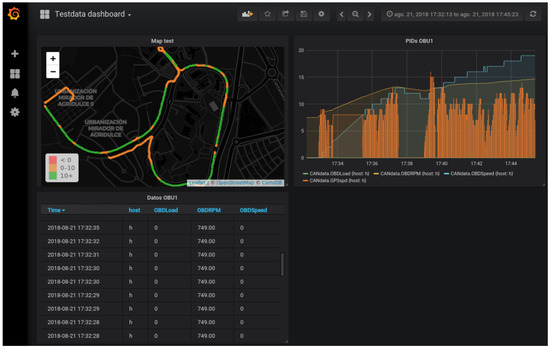 The data server receives the UDP data messages and feeds an InfluxDB database. This server also hosts a dashboard, implemented with Grafana [32], which takes data from the database to show all vehicle parameters in real-time. A set of plots, with their corresponding database queries, have been included in the interface to show, among others, the path followed by a vehicle, individual OBD parameters, or a mix of them, and alerts attending to pre-configured events or thresholds.
