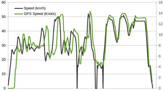 An interesting issue, detected when gathering the vehicle speed, was the difference between OBD and GPS data. Figure 10 shows the speed reported in one of the tests. It can be seen that GPS speed values are delayed, as compared with the OBD data. This is attributed to two factors: The positioning algorithm, which uses cumulative data to compute fixes, and the buffering carried out by the GPS UNIX daemon used (gpsd), which saves the last computed position to serve requests from the OBU data gathering application.
