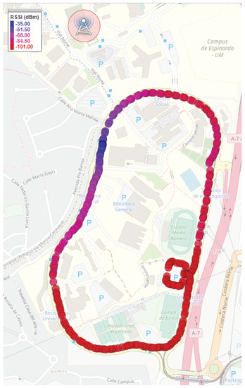 In order to validate our proposal in a real scenario from a communications perspective, a performance evaluation of LoRaWAN was also conducted around the university campus, obtaining the results shown in Figure 11. Concretely, the LoRaWAN-enabled OBU periodically transmitted data packets to the gateway with the aim of finding non-covered zones. The RSSI, measured by the gateway in dBm, is plotted on the campus map, indicating good operation of the system around the ring. It can be seen that lower RSSI values are obtained in the lower right corner, which represents a location at 1.4 km away from the gateway. The effect of buildings is noticeable, observing the greatest RSSI values, which are not obtained at the nearest area. This is due to a group of buildings, south-east of the gateway location. In fact, as expected, the best coverage is obtained when a direct line of sight is obtained through the buildings (blue spots). Overall, observe that the lowest RSSI level attained was dBm, far from the gateway receiving sensitivity; around dBm.