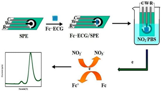At first, 0.5 mmol·L−1 of Fc(Cys)2 stock solution was prepared by dissolving Fc(Cys)2 in acetonitrile solvent. 0.5 mmol·L−1 Fc-ECG stock solution was prepared by dissolving Fc-ECG in Milli-Q water. 10.0 mmol·L−1 nitrite stock solution was prepared by dissolving sodium nitrite in Milli-Q water. 0.1 mol·L−1 phosphate buffer solutions (PBS) with various pH values were used as the supporting electrolyte, and prepared by mixing 0.1 mol·L−1 NaH2PO4 and 0.1 mol·L−1 Na2HPO4. The pH value of PBS was adjusted by 0.1 mol·L−1 of H3PO4 and 0.1 mol·L−1 of NaOH solution. The prepared solutions were stored in a refrigerator at 4 °C. All stock solutions were diluted to the appropriate concentration before experiment, including separated pickle juice directly diluted by PBS. Then, the fabrication of the sensors were carried out by depositing either electroactive material Fc(Cys)2 or Fc-ECG onto the surface of the SPE for 30 min until dry, and electrochemical sensors of Fc(Cys)2/SPE and Fc-ECG/SPE for nitrite detection by DPV were prepared. The preparation of electrochemical sensor of Fc-ECG/SPE for nitrite detection by DPV is simple and described in Figure 1.