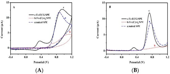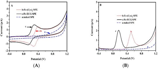 As can be seen in Figure 3A, curve a was a straight line and there was no electrocatalytic response from the naked SPE in PBS. After depositing Fc(Cys)2 or Fc-ECG onto the surface of SPE, electro-catalytic response of two modified SPEs were observed in curves b and c, respectively. Fc(Cys)2/SPE showed redox peaks at 0.40 and 0.28 V with 1.45 μA and -1.34 μA peak current response, respectively. The Fc-ECG/SPE showed redox peaks at 0.29 and 0.13 V with 1.71 and −1.12 μA peak current response, correspondingly. The electrochemical process indicated a quasi-reversible reaction, for both Fc(Cys)2/SPE and Fc-ECG/SPE. Similar results were observed from DPV signals at 0.5 and 0.16 V with peak current response of 1.73 and 2.06 μA, as shown in Figure 3B. All the results illustrated the successful modification of the electrodes by different active electrochemical materials, which was consistent with the SEM results.