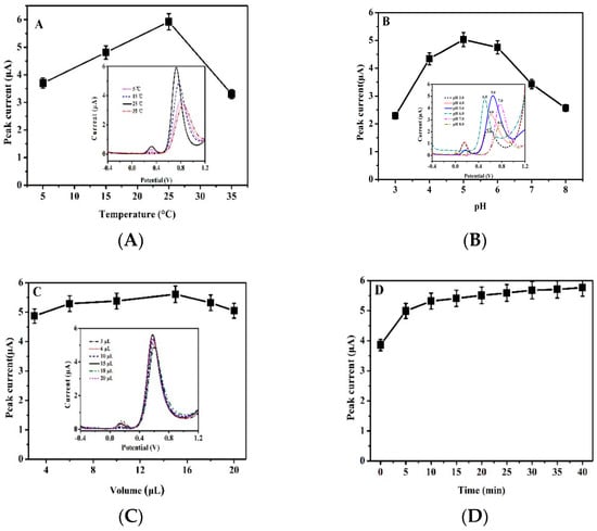 Current responses (The inserts are DPV curves) for 50 μmol·L−1 nitrite oxidation on Fc-ECG/SPE sensor in 0.1 mol·L−1 PBS with a pulse amplitude of 50 mV. (A): pH 7.0, at 5, 15, 25 and 35 °C; (B): pH 3.0, 4.0, 5.0, 6.0, 7.0, 8.0, at 25 °C; (C): pH 5.0, with 3, 6, 10, 15, 18, 20 μL of Fc-ECG on electrode at 25 °C; (D): pH 5.0, with 0-40 min reaction time at 25 °C.