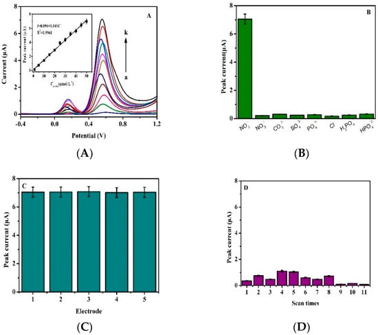 (A): DPV for different concentrations of nitrite on Fc-ECG/SPE (a-k: 1.0, 5.0, 10, 15, 20, 25, 30, 35, 40, 45, 50 μmol·L−1), insert: calibration plot for various concentrations of nitrite; (B): The selectivity of Fc-ECG/SPE sensor for nitrite, NO3−, CO32−, SO42−, PO43−, Cl−, H2PO4−, and HPO42−, the concentration of each compound is 100 μmol·L−1; (C): The repeatability of Fc-ECG/SPE sensor; (D): The stability of Fc-ECG/SPE sensor.