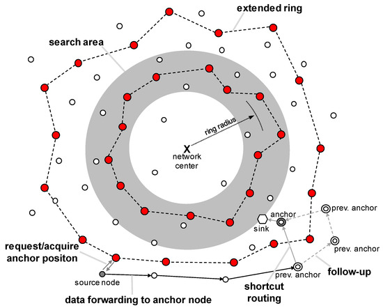 This study concerns ring routing [5], which is a kind of area-based scheme. This scheme consists of a ring node, an anchor node, and a normal node. As shown in Figure 1, the gray search area separated by a ring radius distance from the center of the network is used to construct the ring. The nodes in this search area are connected to each other to form a ring, and only nodes belonging to the ring, which are called ring nodes, maintain the information on the location of the mobile sink.