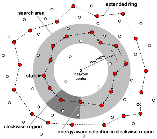 The selection of a ring node to construct a ring is performed using Equation (4). First, one of the nodes in a search area whose residual energy satisfies Equation (4) starts to construct the ring by finding and connecting to a node in a search area that also satisfies Equation (4) among the neighbors in the left region with respect to itself when looking at the center of the network. For convenience, we refer to this side of region as the clockwise (CW) region of that node and the opposite side as the counter-clockwise (CCW) region. The dark gray region in Figure 4 represents the CW region relative to .