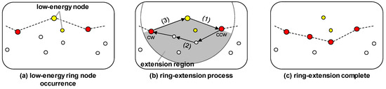 Figure 5 illustrates the process of extending the ring. If the energy state of the ring node no longer satisfies Equation (4), so that it becomes difficult to act as a ring node, as illustrated by the yellow ring node in Figure 5a, then the ring is extended as shown in Figure 5b, which is explained step-by-step as follows: