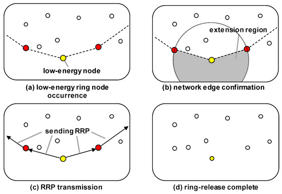 If the energy state of a node does not satisfy Equation (4), as shown in Figure 6a, then the ring extension process is performed. However, if the node is at the edge of the network, as shown in Figure 6b, then the ring release is performed, because the ring cannot be extended anymore. As shown in Figure 6c, when the ring is released the node that initiates the ring release process sends a ring release packet (RRP) to its neighbor ring nodes on both sides of the same ring, and the nodes that receive this relay it to their neighbor ring nodes. After this each ring node changes its role to be a normal node, and when all the ring nodes have received an RRP, the ring release operation is completed, as shown in Figure 6d.