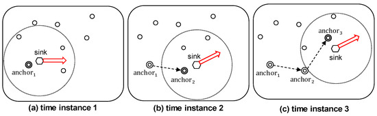 Figure 7 illustrates the change of anchor node when the sink is continuously moving. During the time that the anchor node is still within the communication range of the mobile sink, as shown in Figure 7a, the anchor node does not change. In contrast, when the mobile sink moves out of communication range, as shown in Figure 7b, it must select a new anchor node. If the sink moves out of the range of , as shown in Figure 7c, then is selected as a new anchor node, and its information is transmitted to the previous anchor node .