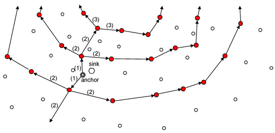 - Anchor node selection: When the sink selects an anchor node, nodes close to the sink node can obtain location information for the anchor node by overhearing packets transmitted between the sink node and anchor node (the green node in Figure 12).