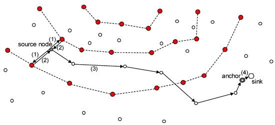 A source node requires location information for the anchor node for data transmission. As shown in Figure 9, the process of obtaining the location information for the anchor and delivering the data to the sink node proceeds as follows: