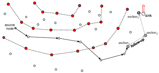 A mobile sink with high mobility can move while data is being transferred from a source node to the anchor node, which can lead to a loss of data. To prevent this, MRR employs the follow-up mechanism illustrated in Figure 10. As described in Section 3.4.3, the previous anchor node stores the location of the successor. Based on this location information, it is possible to forward data to the new anchor node even though there is no sink close to the anchor node that received the data.