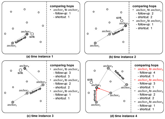 where is the number of hops from the anchor node i to the current anchor node, and is the number of hops on the shortest path. is a weighting factor, with a default value of 2, and this increases in proportion to the speed of the mobile sink node. The reason for being at least 2 is because the previous anchor node must receive a request packet for shortcut routing from the sink node to perform shortcut routing, which results in an overhead. Figure 11 shows an example of determining whether to employ shortcut routing when the previous anchor nodes (∼) send data to the current anchor node (). and perform shortcut routing, because they satisfy Equation (5), while and perform the follow-up mechanism.