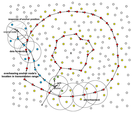 As shown in Figure 1, a sensor node that wants to transmit data to the sink requires the location information of the anchor node. To this end, it sends a packet requesting the location information of the anchor node in the direction of both the center and outside of the network, and receives a response packet with the location information. This bidirectional transmission ensures that the packet encounters one of the ring nodes. After receiving the location information of the anchor node, the sensory data is routed to the anchor node using the location-based routing method.
