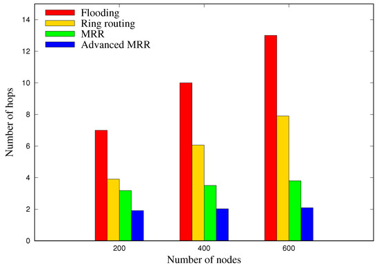 Figure 13 shows the average number of hops for each node to obtain location information of sink node from the ring, according to the various network sizes. The flooding scheme, in which the sink node broadcasts its location to all nodes whenever it moves, exhibits the highest increase in the overhead, with up to about 13 hops at 600 nodes. The number of hops for our MRR scheme is lower by 22%, 42%, and 56% in comparison with the original ring routing method when the number of nodes is 200, 400, and 600 respectively. This is because the MRR scheme creates and utilizes multiple rings unlike the original ring routing scheme as shown in Table 4. Note that as explained before, maintaining multiple rings in MRR scheme does not reduce the functionality of each node because it only uses extra energy to maintain multiple rings, which would be proved in Section 5.3. Finally, it can be seen that the advanced MRR scheme, which reduces the number of anchor node location requests through overhearing, reduces the number of hops by approximately 46% compared with the MRR scheme. Additionally, it can be confirmed that unlike the flooding or ring routing, the overheads (number of hops in Figure 13) required to acquire the location information of sink node, in both of MRR and advanced MRR, are hardly affected by the network size. This result demonstrates that the proposed MRR and advanced MRR are much more scalable than other schemes.