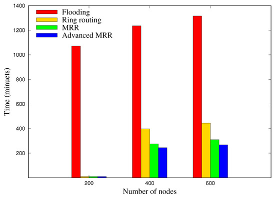 Figure 14 depicts the average blackout time of each node for 30 days, according to the network size. Overall, the blackout time of flooding scheme is extremely high compared with the other schemes since it works in a way that consumes a lot of energy, and the advanced MRR shows the least blackout time, regardless of the network size. In the case of 600 nodes, for example, the number of blackout nodes in MRR was reduced by 78% and 31% compared to flooding and ring routing, respectively, and that of advanced MRR was 9% lower than MRR. These results prove that maintaining multiple rings in MRR and advanced MRR schemes does not degrade the functionality of each node because they only use extra energy to maintain multiple rings. We also infer that the advanced MRR schemes show the fewest blackout nodes due to the overhearing and shortcut routing.