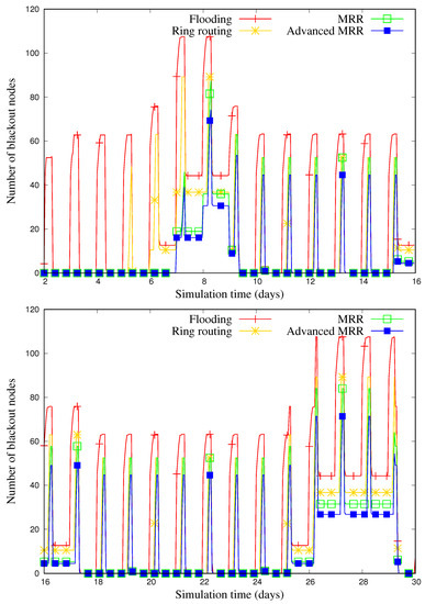 Figure 15 illustrates the change in the number of blackout nodes over time for 30 days, when the number of nodes is 600. Overall, for all of schemes, it is shown that the number of blackout nodes increases when the weather is rainy or cloudy and decreases when it is sunny. Although the value varies depending on the weather, we can find that the MRR and advanced MRR are less affected by the weather than other schemes because of their energy-aware operation.