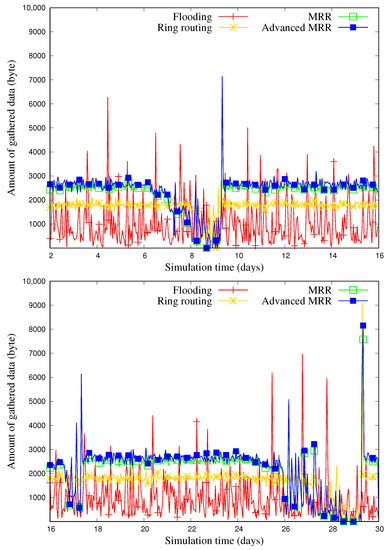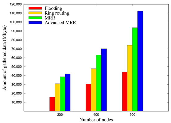 Figure 16 shows the amount of data gathered at the sink node for 30 days, according to the network size. In the case of 400 nodes, the amount of gathered data in MRR was greater by 116% and 38% compared with the flooding and ring routing schemes, respectively, and in the advanced MRR scheme this was 9% greater than for MRR. In the case of 600 nodes, the advanced MRR scheme increased the amount of gathered data by 144%, 57%, and 18% compared with other three respective schemes. We note that the difference became larger as the network size increased.