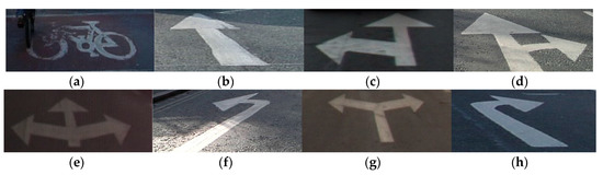 Road marking objects. (a) Bike. (b) Forward arrow. (c) Forward-left arrow. (d) Forward-right arrow. (e) Forward-left-right arrow. (f) Left arrow. (g) Left-right arrow. (h) Right arrow.