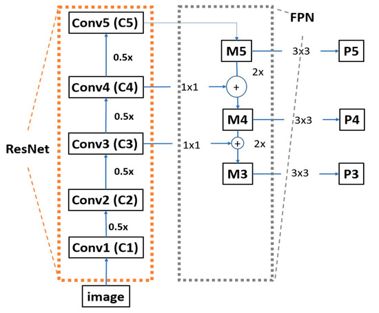 As specifically depicted in Figure 5, when we trace the top-down path in the FPN, a 1 × 1 convolutional filter is applied to reduce C5 channel depth to 256-d to create M5, and a subsequent 3 × 3 convolution is performed to create P5, which becomes the first feature map layer used for object prediction [15]. For each subsequent layer, we up-sample the previous layer by 2 using nearest neighbor up-sampling and apply a 1 × 1 convolution to the corresponding feature maps from ResNet. Then, we add the up-sampled feature map to the output feature map by 1 × 1 convolution based on element-wise summation and repeat this process with 3 × 3 convolution to obtain the corresponding feature map layer.