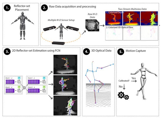 DeepMoCap pipeline overview. After the placement of the reflectors on the subject’s body (1), spatio-temporally aligned IR-D streams are acquired and processed (2) to feed the FCN with colorized depth and 3D optical flow images (3). The FCN outcome, i.e., the multi-view 2D reflector-set estimates, is fused to extract the 3D optical data (4) and, finally, yield the subject’s 3D pose for motion capture (5).