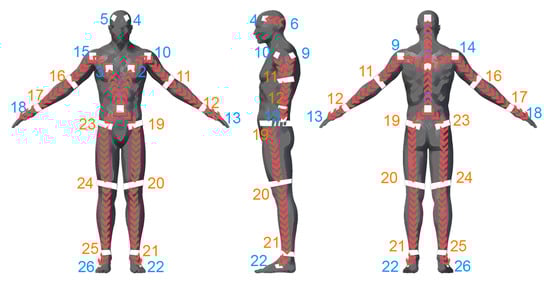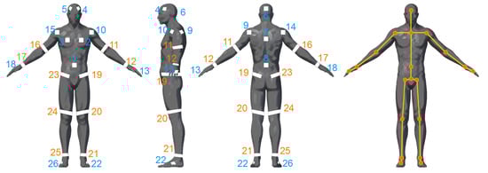 The reflector-set placement has been designed to provide robust and highly informative motion capture data, i.e., capturing large number of degrees of freedom (DoFs). The selected placement is shown in Figure 2, consisting of a set of 26 reflectors , 16 patches and 10 straps, enabling motion capture by fitting an articulated body structure of 40 DoFs. The use of both straps and patches has been chosen due to the fact that the straps are 360°-visible on cylindrical body parts (i.e., limbs), while patches have been used on the body parts where strap placement is not feasible, i.e., torso, head and hands. Aiming to highlight the distinction between the front and the back side of the body, the reflective patches are not symmetrically placed. On the front side, two reflector patches are placed on the head, two on the chest and one on the spine middle, while on the back side, one is placed on the head, one on the back and one on the spine middle. The retro-reflective material used to create the reflector-set is the off-the-shelf 2-inch reflective tape used in protective clothing []. Following carefully the matching between the reflectors and the body-parts of the subject as depicted in Figure 2, the reflector-set placement is a fast procedure (it lasts approximately 2 min), since the sticky straps and patches are effortlessly placed, not requiring high placement precision (it is enough to be approximately placed to the body part locations shown in Figure 2).