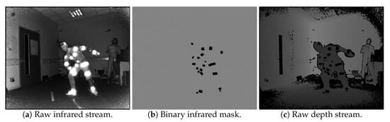 After the reflector-set placement, the subject is ready to be captured. Let us consider the use of N IR-D devices, thus, N is also the number of views . Using the multi-Kinect for Xbox One capturing setup proposed in [], spatio-temporally aligned multi-view IR-D data are acquired. All reflector regions have distinguishable pixel values on IR images (Figure 3a), thus, applying binary hard-thresholding, the binary mask of the reflectors is extracted (Figure 3b). The corresponding regions on the raw depth images (Figure 3c) have zero values due to the retro-reflections.