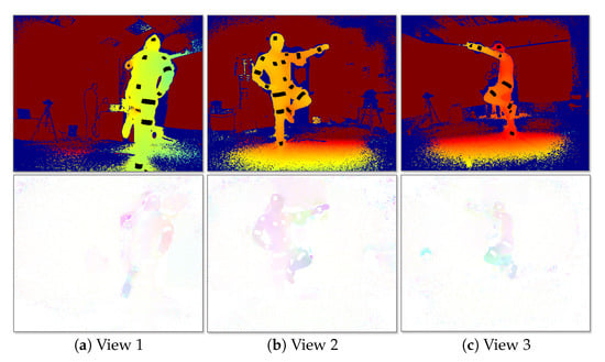 The multi-view IR-D raw data are processed before feeding the FCN. On the one hand, the IR-D frames are jointly processed in order to compute the 3D optical flow of the body movements. In the present work, the primal-dual algorithm proposed in [] is considered due to its demonstrated efficiency on relevant computer vision tasks, such as interaction-based RGB-D object recognition [] and 3D action recognition []. In particular, the 3D motion vectors between two pairs of IR-D images and their magnitude are computed. The 3D flow and its magnitude are then colorized by normalizing each axis values and transforming the 3D motion vectors into a three-channel image. On the other hand, the depth images are colorized applying color map conversion. Finally, the reflector mask is subtracted from the colorized depth images, resulting in colorized depth with reflector black regions, , facilitating the detection of the reflectors. The colorization step for both streams is required in order to allow the usage of the proposed FCN, initialized by the first 10 layers of VGG-19 []. An example of the processed multi-view outcome is shown in Figure 4.